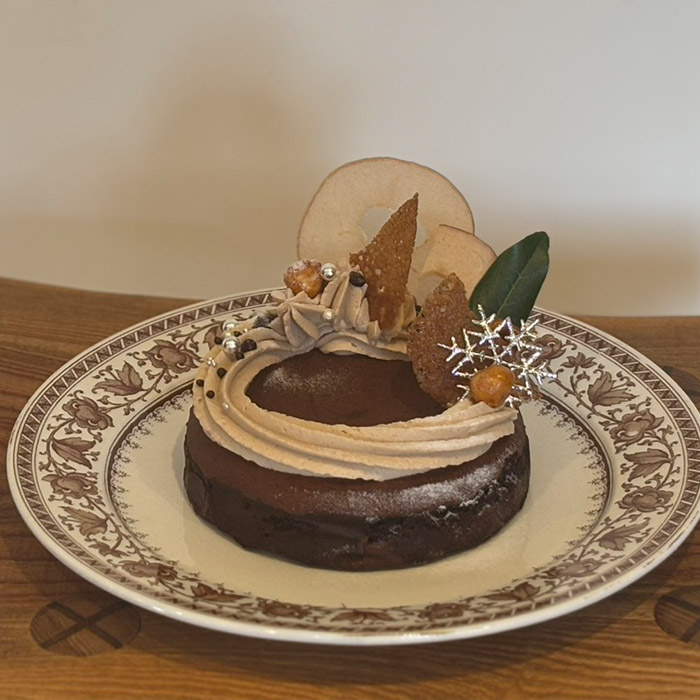 蒸し焼きショコラは、有機チョコレートを使用し、じっくり低温で蒸し焼き、濃厚な仕上りに。リースの部分はヘーゼルナッツクリームになります。